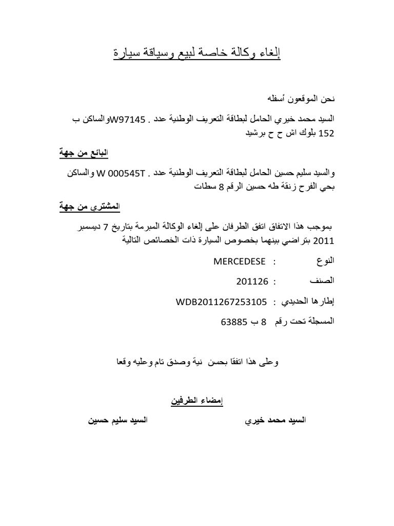 إلغاء وكالة خاصة لبيع وسياقة سيارة